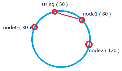 将string交给hash函数处理,换成整数比如为50,可以在环上找到一个对应的位置。然后处理服务器的IP也换算成整数,这里比如有node0为30、node1为80、node2为120,那么根据数据映射到Memcached服务器上的规则,从当前key的位置,沿着圆环顺时针方出发,查找位置离得最近的一台Memcached服务器进行数据存储,那么离50顺时针方向最近的数为80,所以就存储在node1这台服务器上。也很好理解。