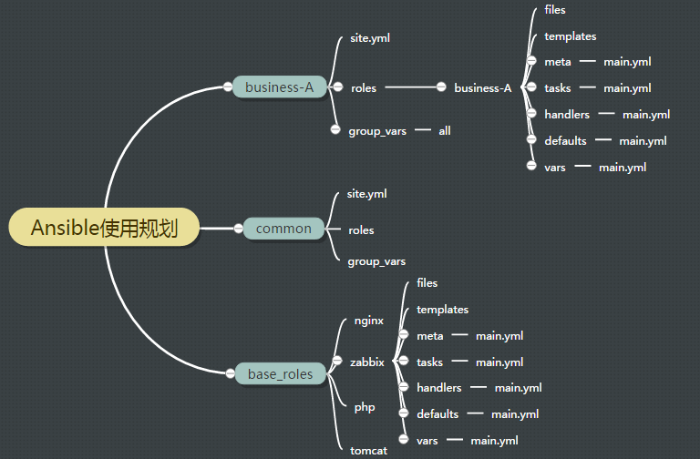 由上图可以看到,每个业务(business-A)为一个playbook,另外创建了一个系统初始化时需要使用的playbook(common),同时创建一个base_roles目录,里面存放各种业务组件,每一个业务组件也都是一个playbook。